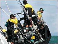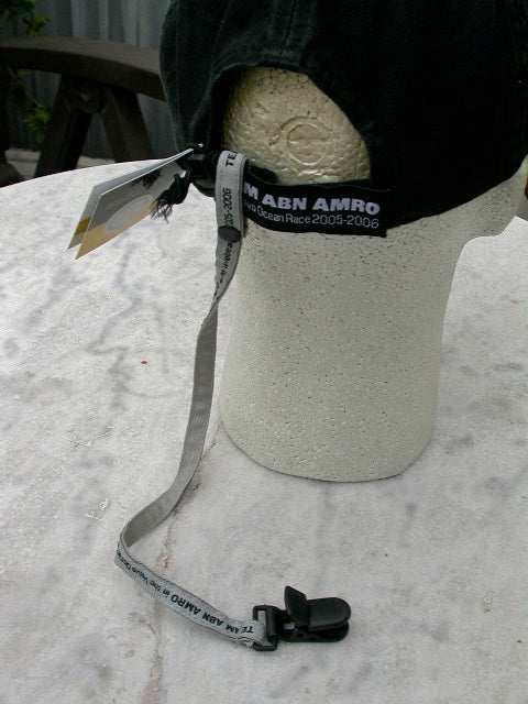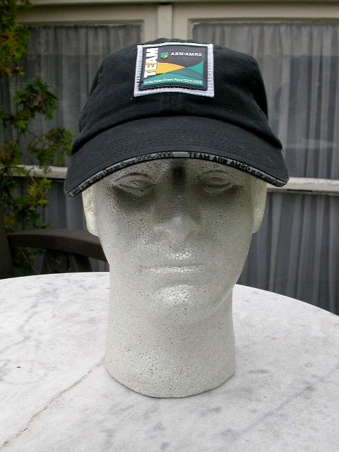 The cap was manufactured in Italy by the firm Fabrizio. It was designed by Danielle Monti especially for Team ABN-AMRO. The cap is 100% cotton and is super comfortable. It is well constructed from multiple pieces of colored cotton fabric. It features the rubberized ABN-AMRO team logo and a piece of the original hi tech sail material that was partially responsible for ABN AMRO's awesome performance. Around the edge of the bill, there is discrete writing stating, "TEAM ABN AMRO in the Volvo Ocean Race 2005-2006". This type of cap was issued to crew of the two ABN-AMRO yachts for the race - see the picture showing one being worn on far left!