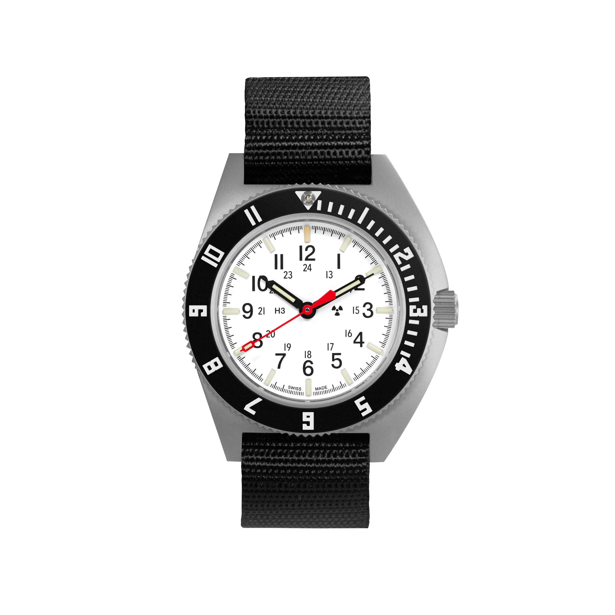 Self-contained tritium gas tubes on the hour markers, and full hand set ensuring constant visibility in low-light environments. Tritium tubes are self-illuminating, containing an isotope of hydrogen that won't dull down over time like photoluminescent paint, meaning the watch will remain fully legible at all hours.