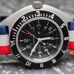 The original steel navigator was produced in the 1980s and features a dial and hand set with tritium pigmented indices.  In 1990, the US Government began requiring that radioactive tritium be encapsulated within small glass tubes for safety as well as the fact that doing so provided a self-illuminating light source.  The resulting steel Navigator watch was issued to US Military pilots and Navigators during the first Gulf War era.  These watches featured a Rhonda movement which has now been discontinued.  In 1999, a small batch of steel Navigators was reissued with an improved movement and orange tritium marker at the 12 position.  These can be easily identified with a small crown as well.  Windy City Watch Collector marketed and sold these on our website.  We recommended them to Military Watch Collectors.  Those steel Navigator reissue watches are now collectible and have appreciated quite a bit in value.
