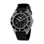 Exclusive, limited production, Type II, Pilot's Quartz with Date, Sapphire crystal and Tritium, black U.S. Air Force dial. A robust tool watch representing a fully re-engineered upgrade to the original Steel Navigator, developed in partnership with Kelly Air Force Base in 1986. The Steel Navigator with Date boasts enhanced functionality and unmatched accuracy, catering to pilots, parachutists, and adventurers. This limited-run watch is available exclusively at Windy City Watch Collector. When they're gone, they're gone! Supplied on single-piece Ballistic nylon strap. Full 2-year Manufacturer's warranty.