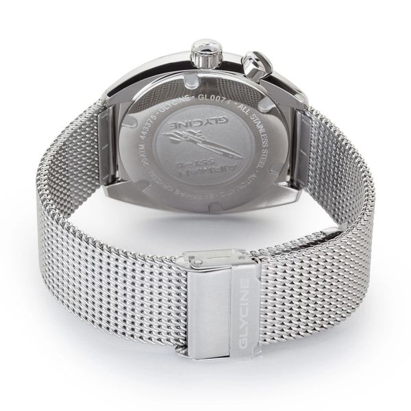 Movement: Swiss Made Glycine caliber GL-293 Automatic - Modified ETA 2893-2 featuring a customized Glycine rotor and Incabloc shock system. Oscillating weight on ball bearing is rhodium coated, decorated “Côtes de Genève”, and bears the engraving of an airplane