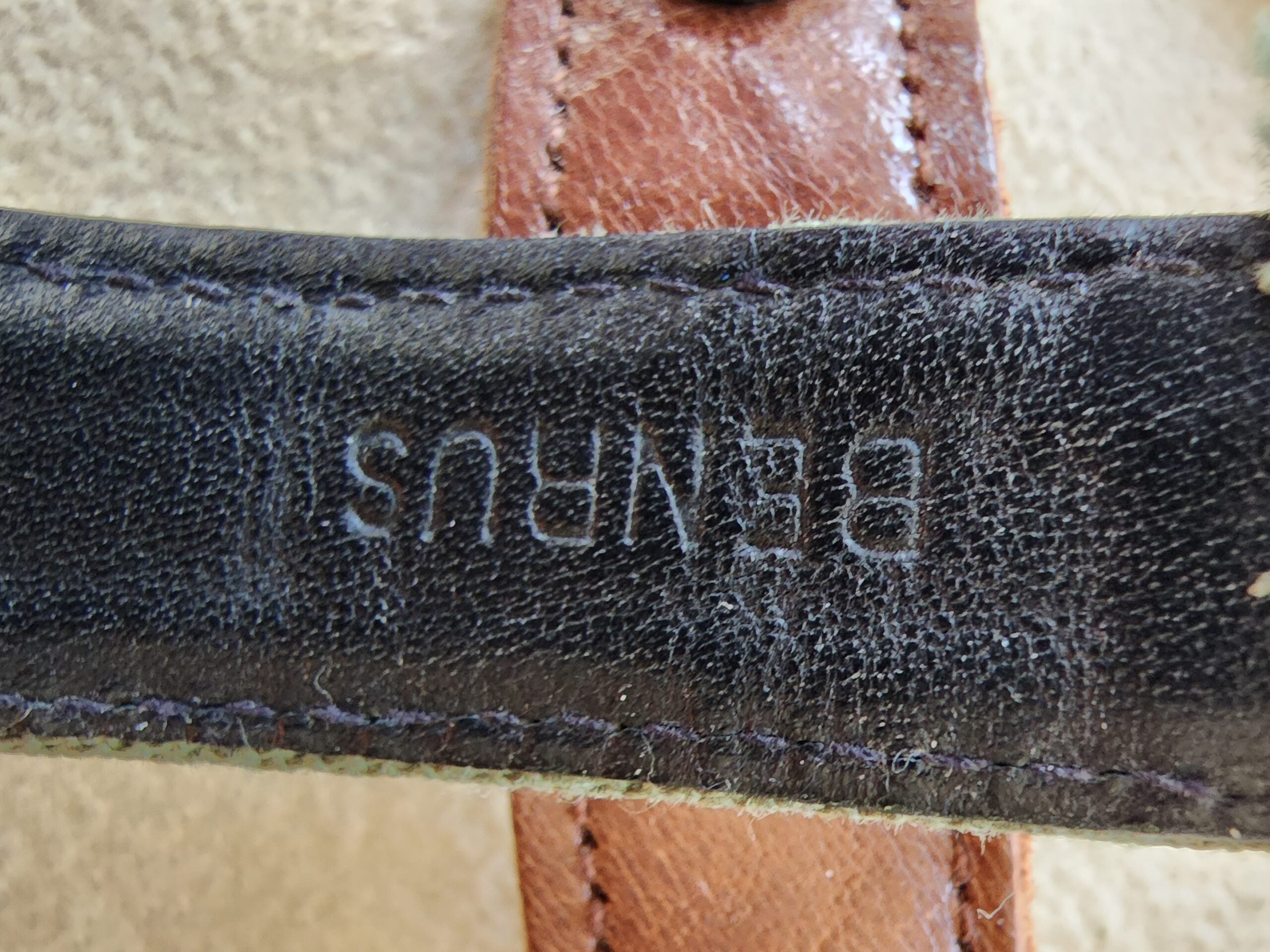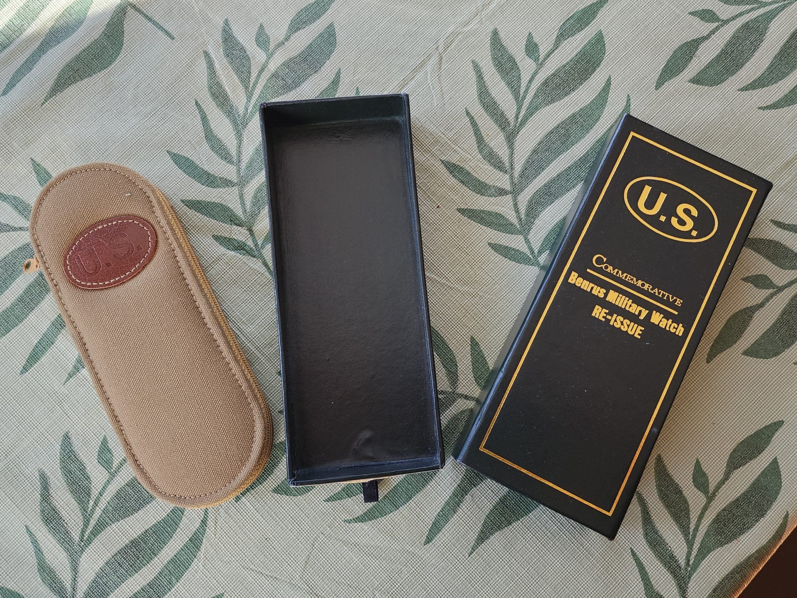 This Benrus 50th Anniversary D-Day Military Watch is a nice mechanical collectible, commemorating the 50th anniversary of D-Day. It is in like new condition, with light signs of wear. No major scratches. New old stock 18mm strap included. The Swiss made strap is OD cotton canvas on the outside and black leather on the inside. Comes with original box, case and papers included. These were manufactured in 1994 to commemorate the 50th anniversary of D-day. Though Benrus actually supplied military wristwatches during Viet Nam war, and into the 1970s, this is a modern representation of military wristwatch from WWII. It is more modern in size being 33x44mm excluding the crown. The dial features Luminova paint which glows well and a 24hr inner track to keep military time. The movement is a high quality 17 jewel Eta 2801 Swiss hacking movement. You pull the crown out and the movement stops so it can be synched with a master time source. This is the same movement that was used in the famous Hamilton WW-G-113 watches from the late 1970s and 1980s. It is also the trusted movement that Marathon Watch Company selected to put in its popular General purpose mechanical military watch. A reproduction mechanical wind-up watch, assembled in the U.S. factory includes a stainless steel water-resistant case, Swiss movement with a full 17 jewel mechanism, and luminous dial and hands. This watch also features the "hack" feature that permits the sweep second hand to stop when the crown was pulled. The watch was issued with an O.D. green tropical weather canvas strap and a canvas/leather field pouch and came in a presentation box.