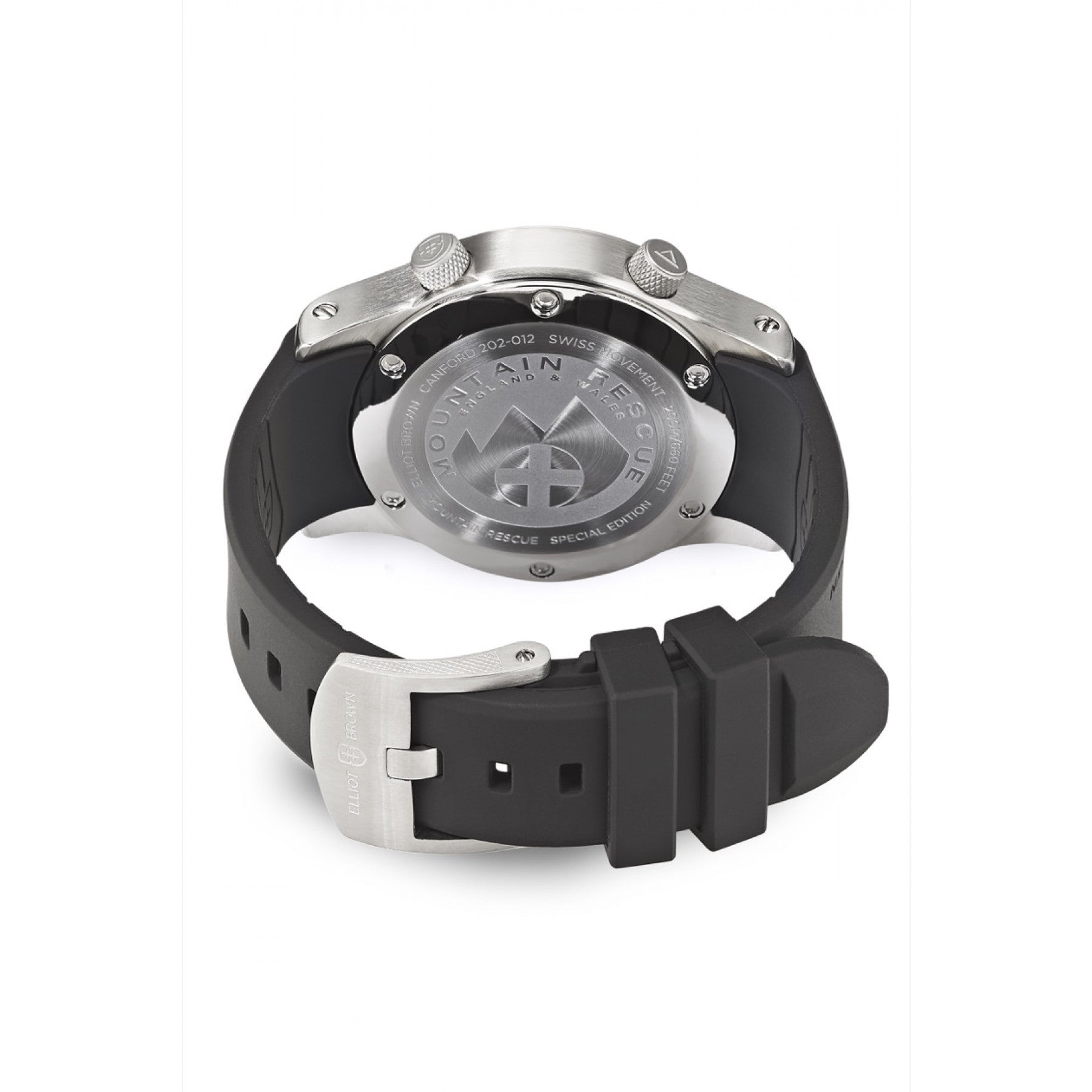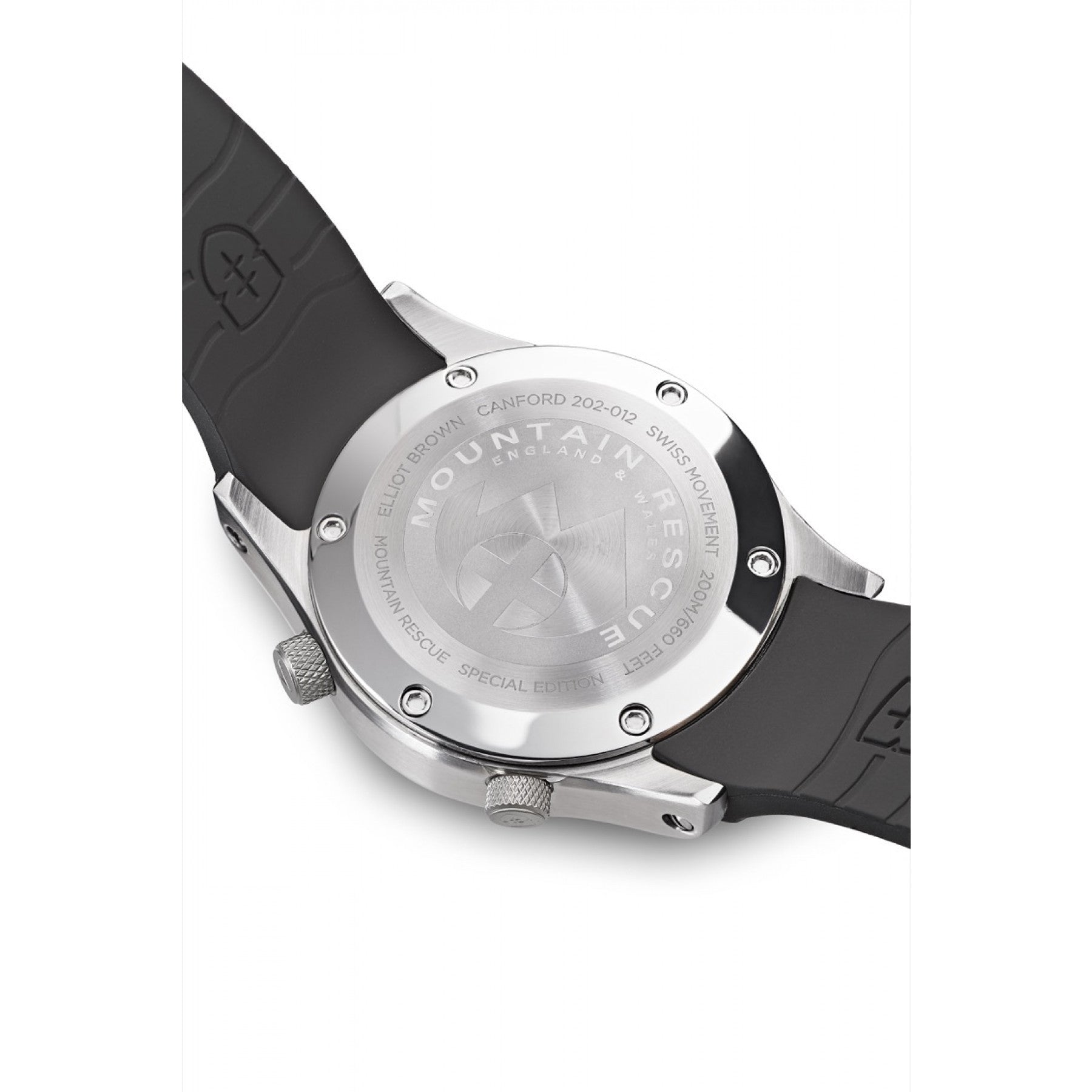 Designed in collaboration with Mountain Rescue England and Wales, the Canford Mountain Rescue features a unique caseback with deep-etched special edition Mountain Rescue logo. For outstanding visibility, extra bold hour batons stand out on the dial, matched to bright white hands filled with green SuperLuminova and a fully luminised seconds hand. The inner timing bezel now features an oversized 12h triangular marker with an MREW inspired red outline. To adjust the inner timing bezel, the crown needs to be pulled away from the case and rotated. Once set to the minute hand or in advance of the minute hand for count down timing, it's simply pressed back into the case to disengage from the bezel. Also included in the box is one of our durable black nylon webbing straps with brushed 316L stainless steel hardware. The strap bars screw into the case using a pentalobe Torx tool that locates securely into the end of the strap bar - making for easy strap changes. So you’ve got a classic steel watch on a black rubber strap for the working week, and a hard-as-nails outdoors watch for weekends spent enjoying the countryside and mountains with the added flexibility of changing straps to longer webbing when needed. All the 22mm straps fit this model for personal customization. The perfect mix of luxury and utility. A not insubstantial £35 (approx. $46) will be donated to Mountain Rescue England & Wales for each watch sold, helping Mountain Rescue to buy vital equipment. If you're a first responder or member of a rescue team, please get in touch with proof of affiliation and we'll let you know what we can do in terms of a discount. We are proud to be able to support Mountain Rescue in this way. ElliotBrown wrote a little blog post about how and why they developed this special watch here. For more info on Mountain Rescue England and Wales please visit www.mountain.rescue.org.uk. This watch is a limited edition.