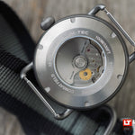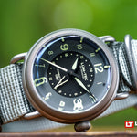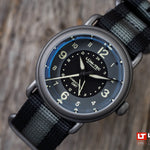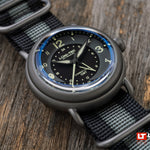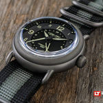 - Charcoal gray and black stripe nylon military strap with 316L Gunmetal PVD hardware