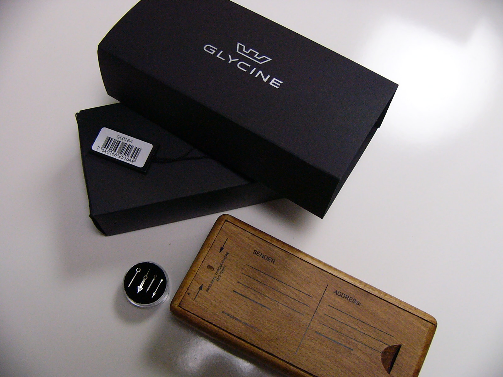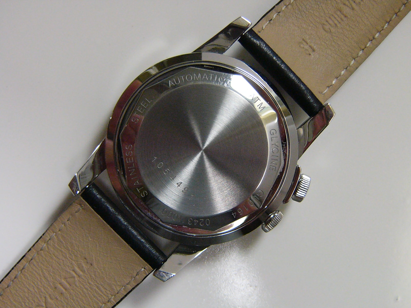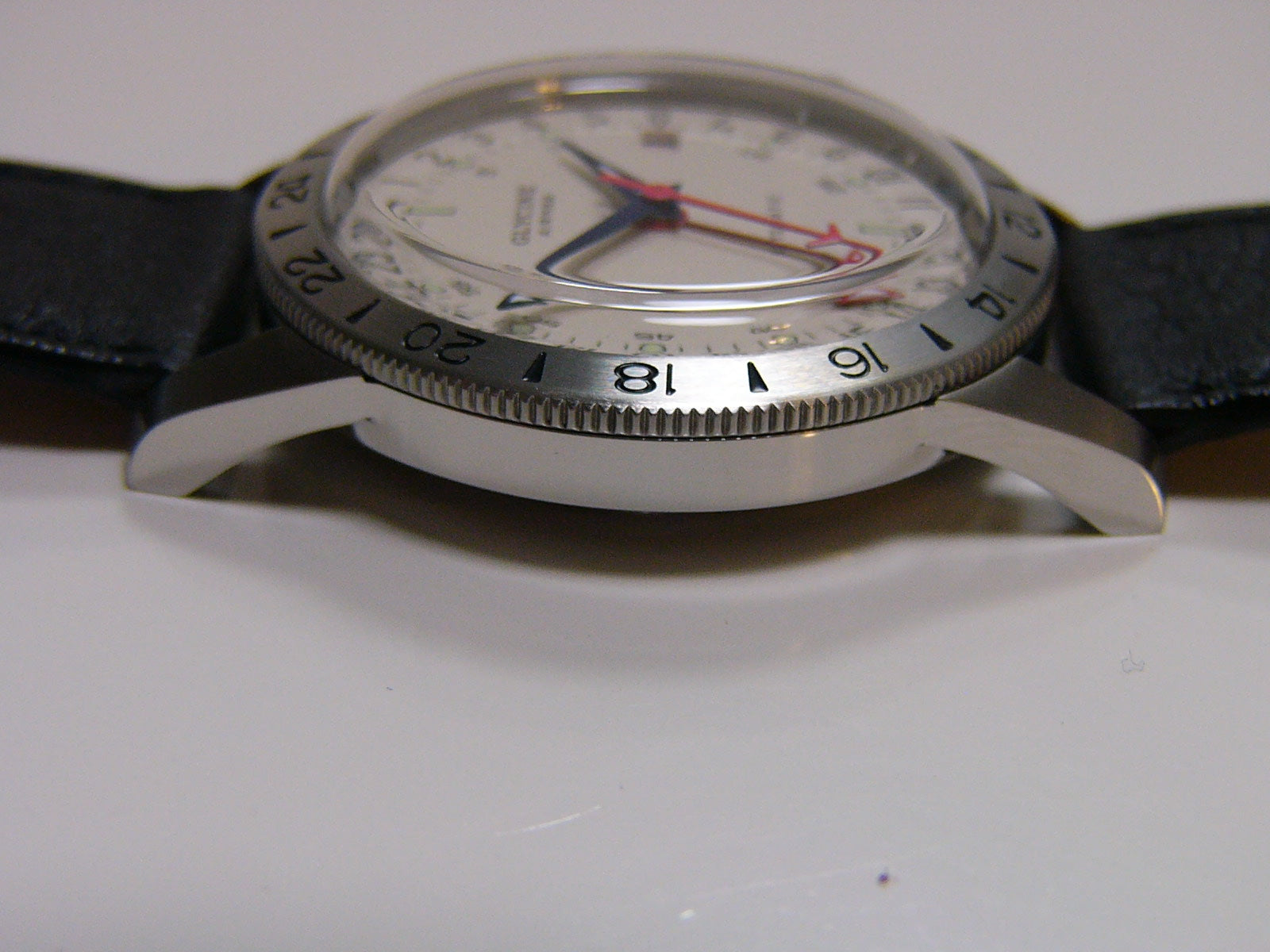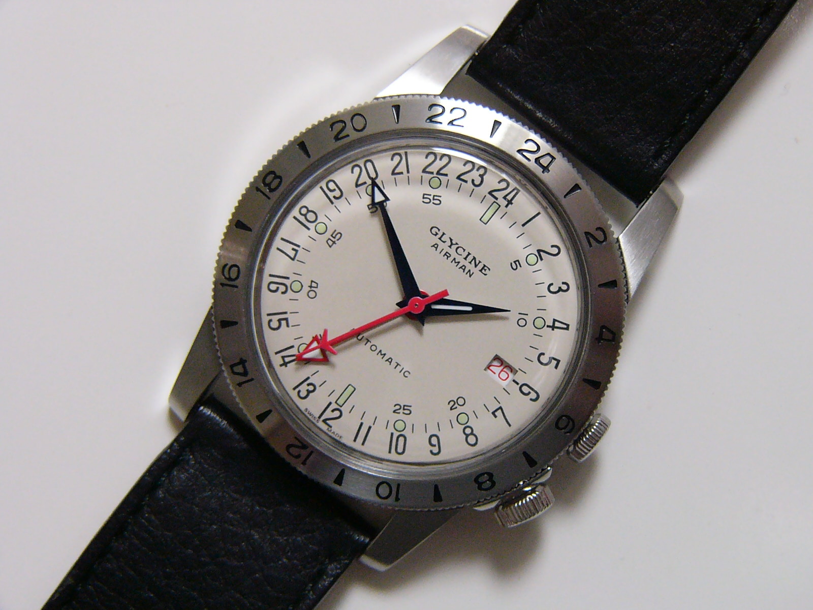 Description: Like new Glycine Airman GL0164 - Limited Edition reissue. We purchased this watch new for review and careful testing. All seals and gaskets have been checked, set and lubed with Silicone DC7 waterproof grease. The watch has been finely regulated, field tested and is operating properly. Brand: Glycine Model Number: GL0164 Model: Airman No. 1 GMT Limited Edition. Material: Polished stainless steel with brushed horizontal surfaces. Crystal: Domed acrylic crystal. Case back: Threaded solid caseback. Function: Time, 2nd time zone, date, center sweep seconds. Dial: Original ivory dial. Hand Set: Blued steel hand set with red arrow GMT hand and sweeping airplane wing red second hand. Original hand set is also included. Movement: Swiss Glycine Calibre GL293. Finely regulated for accuracy. Case Size: 40mm. Condition: Near mint. Straps: 22mm Glycine OEM soft calf strap with OEM brushed buckle. WR: 1 ATM Box and Papers: Original issue wooden box set with sliding top, hang tag and papers.