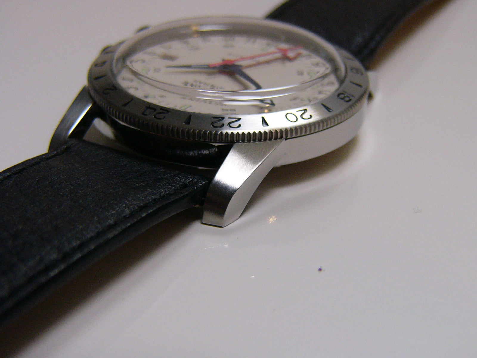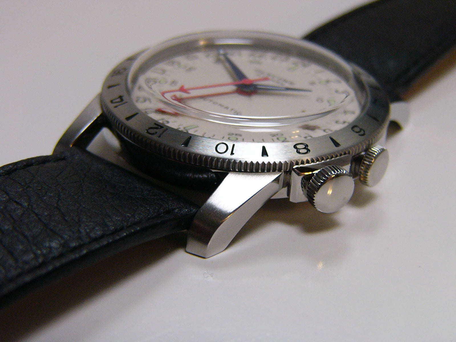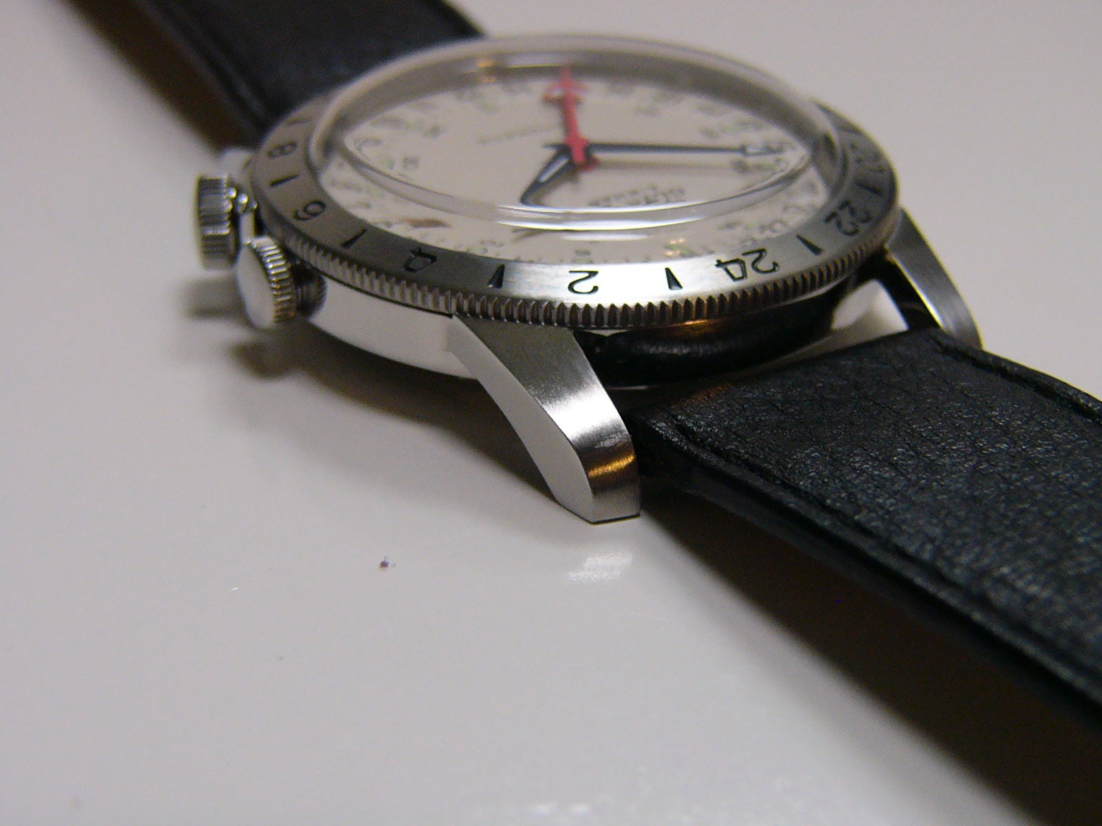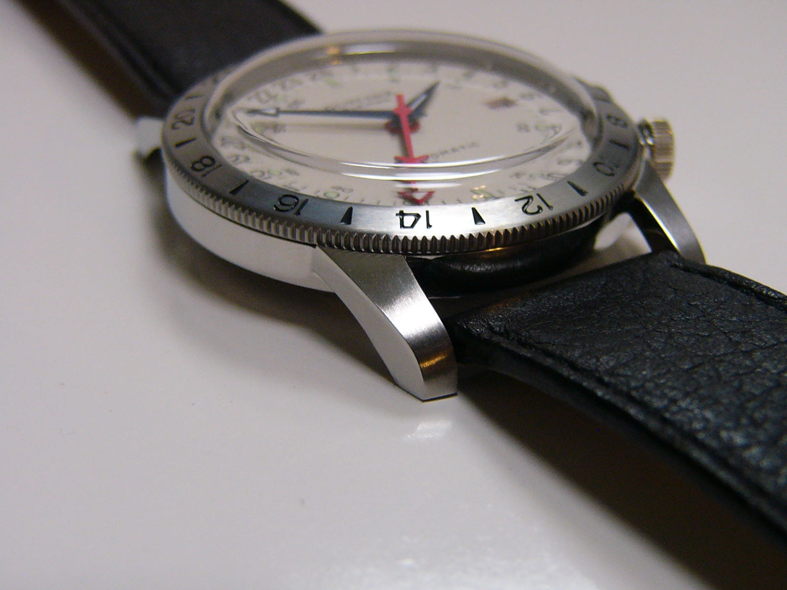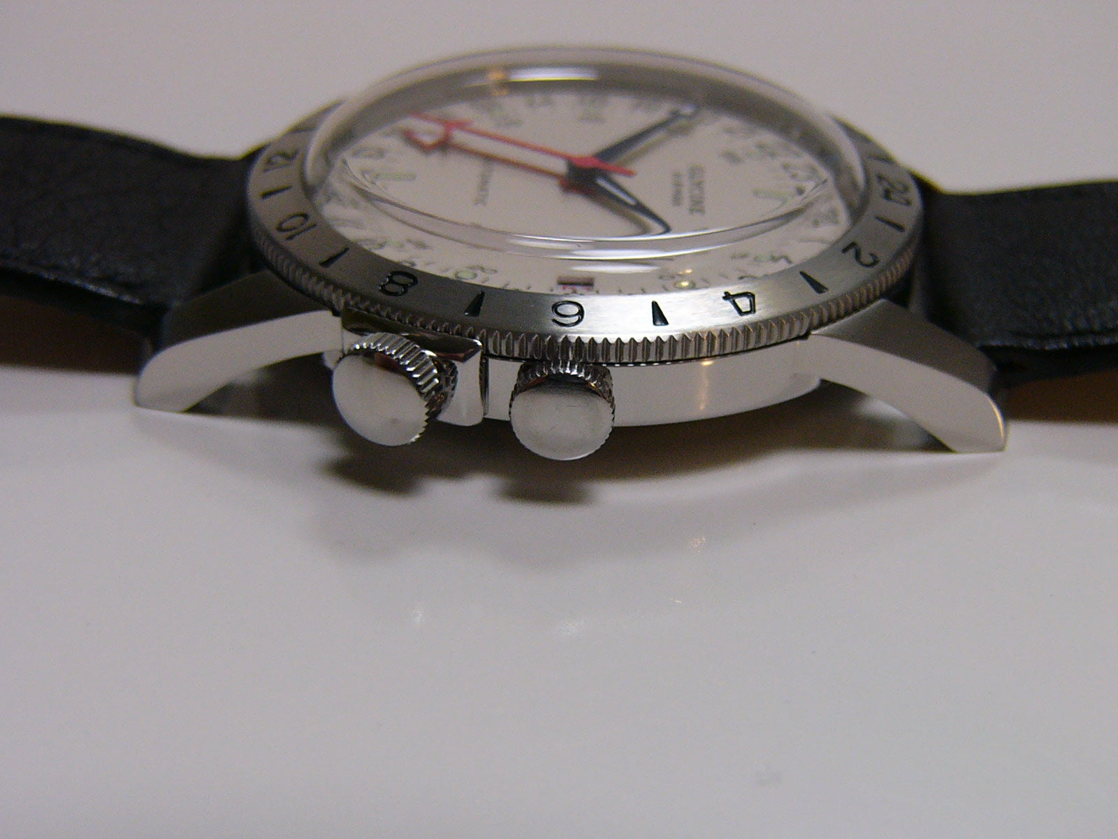 Description: Like new Glycine Airman GL0164 - Limited Edition reissue. We purchased this watch new for review and careful testing. All seals and gaskets have been checked, set and lubed with Silicone DC7 waterproof grease. The watch has been finely regulated, field tested and is operating properly. Brand: Glycine Model Number: GL0164 Model: Airman No. 1 GMT Limited Edition. Material: Polished stainless steel with brushed horizontal surfaces. Crystal: Domed acrylic crystal. Case back: Threaded solid caseback. Function: Time, 2nd time zone, date, center sweep seconds. Dial: Original ivory dial. Hand Set: Blued steel hand set with red arrow GMT hand and sweeping airplane wing red second hand. Original hand set is also included. Movement: Swiss Glycine Calibre GL293. Finely regulated for accuracy. Case Size: 40mm. Condition: Near mint. Straps: 22mm Glycine OEM soft calf strap with OEM brushed buckle. WR: 1 ATM Box and Papers: Original issue wooden box set with sliding top, hang tag and papers.