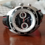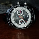 Here is a near-mint example of the classic Pan Europ Chronograph from Hamilton. This watch was taken in on trade from a Canadian collector for a new Marathon JDD The Hamilton Pan Europ Chronograph comes in a 45mm wide almost tonneau-shaped case with a round dial. The design is common to many sport and dive watches of the 1970s. It looks great on the wrist and the panda-style coloring on the dial with the red accents makes it an instant classic. The dial design is honestly not that novel, but rather a very clever assortment of existing elements arranged into an overall very satisfying design. the dial depth is visually pleasing as the sloped flange ring is cut with the applied hour markers. Squared hands are classic and easy to read while a good level of lume coats the dial. Around the dial is a rotating diver’s style bezel. This example has the more desirable black dial (ref. H35756735), Symmetry and traditional class make the Pan Europ a great looking sport watch. It is a unique model, and as such, represents an interesting watch. The Hamilton Pan Europ originally retailed for $1,945.
