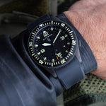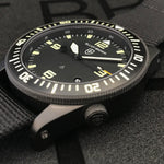 It is fit for purpose and designed for use every day no matter how harsh the conditions. Read on about the special features incorporated into the design of this watch.... Having purchased Elliot Brown watches privately it became clear that British military personnel preferred them to the watches they had previously been issued and approached Elliot Brown to develop a new model specifically for military issue. To develop a new watch from the ground up, Elliot Brown asked military personnel to bring their current resistance and discuss what worked and what didn't, only then were they able to fully understand the requirement and create the internal brief that made sure the new Holton Professional watch would perform faultlessly. The result is the Holton Professional watch with a bead blasted .8 micron PVD coated stainless steel case, patented shock protection system, spring bars that will not break easily, a bezel that can be operated easily even wearing gloves. Its water and dust resistance is up to harsh conditions and it has fit for purpose straps that are easy to change. Finally, it is a watch that is instantly readable day or night thanks to a well-designed dial and bezel utilizing vivid numerals, markers, contrasting markers/handsets and the use of C3 SuperLuminova. The Holton Professional watch is a terrific field and diving watch whose design language echoes that of vintage British military watches yet with all the trademark Elliot Brown house design cues, creating a sense of continuity and familiarity. The specification of the bezel gives perfect insight into the level of detail required for the Holton Professional Watch project to be successful. A precise 120 click high grip bezel houses a stainless steel insert precisely embossed with hours and minutes indentations then flooded with high-grade C3 SuperLuminova. The hobnail outer knurling is slightly higher than the insert to form a high grip surface for trustworthy operation even when using the palm of a wet gloved hand. Both components are matt bead blasted, hardened to 1200HV (Vickers hardness scale) then a 0.8 micron PVD coating is applied whose hardness matches that of the stainless steel components. Straps are easily changed and secured via solid steel screw-in bars operated with an included five-lobe tool and matching socket in the strap bar ends. The recessed crown sits neatly out of harm's way at 4 hour position while retaining the immense water protection afforded by Elliot Brown's proprietary triple seals. An additional screw-down mechanism locks the crown into the case. The Holton Professional Watch has been assigned the NATO stock number 6645-99-303-0677: Time-measuring instruments; United Kingdom, and features the 'Crow's foot/Pusser's Arrow/Broad Arrow' on the dial in subdued grey. The Broad Arrow has historically been applied to UK issued military equipment including British Military watches. The Holton Professional Watch takes its name from Holton Heath in Dorset, the location of a wartime cordite factory from World War I and World War II.