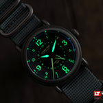 Carefully hand-assembled in Ohio, the Lum-Tec Combat Field X6 GMT Watch captures a sleek and stylish military aesthetic with its titanium carbide-coated casing and 22mm nylon strap. Refined design elements like a double curved sapphire crystal and MDV technology offer attention to detail that only Lum-Tec can. Each Combat Field X6 is crafted with a high-precision tuned Miyota 9075 automatic movement with true GMT and Jump hours complication. The Lum-Tec Combat Field X6 features a 44mm diameter titanium Carbide PVD hard-coated (charcoal color) stainless steel case with a coin-edge bezel. The black dial has been bead blasted to impart rich black color. The hands and hours have been treated with grade X1 LOR SuperLuminova for viewing the time in darkness and low light conditions. A double curved sapphire crystal with military-grade anti-reflective coating helps prevent scratches and provides a clear view of the time. The Combat Field X6 is water-resistant to 100 meters and it comes with two straps - a black military nylon strap and a brown leather strap. Both straps have bead-blasted hardware. 22mm lug width, but it accepts a 24mm military style strap. The Combat Field X2 is a limited edition of 100 worldwide. Each watch is individually numbered.
