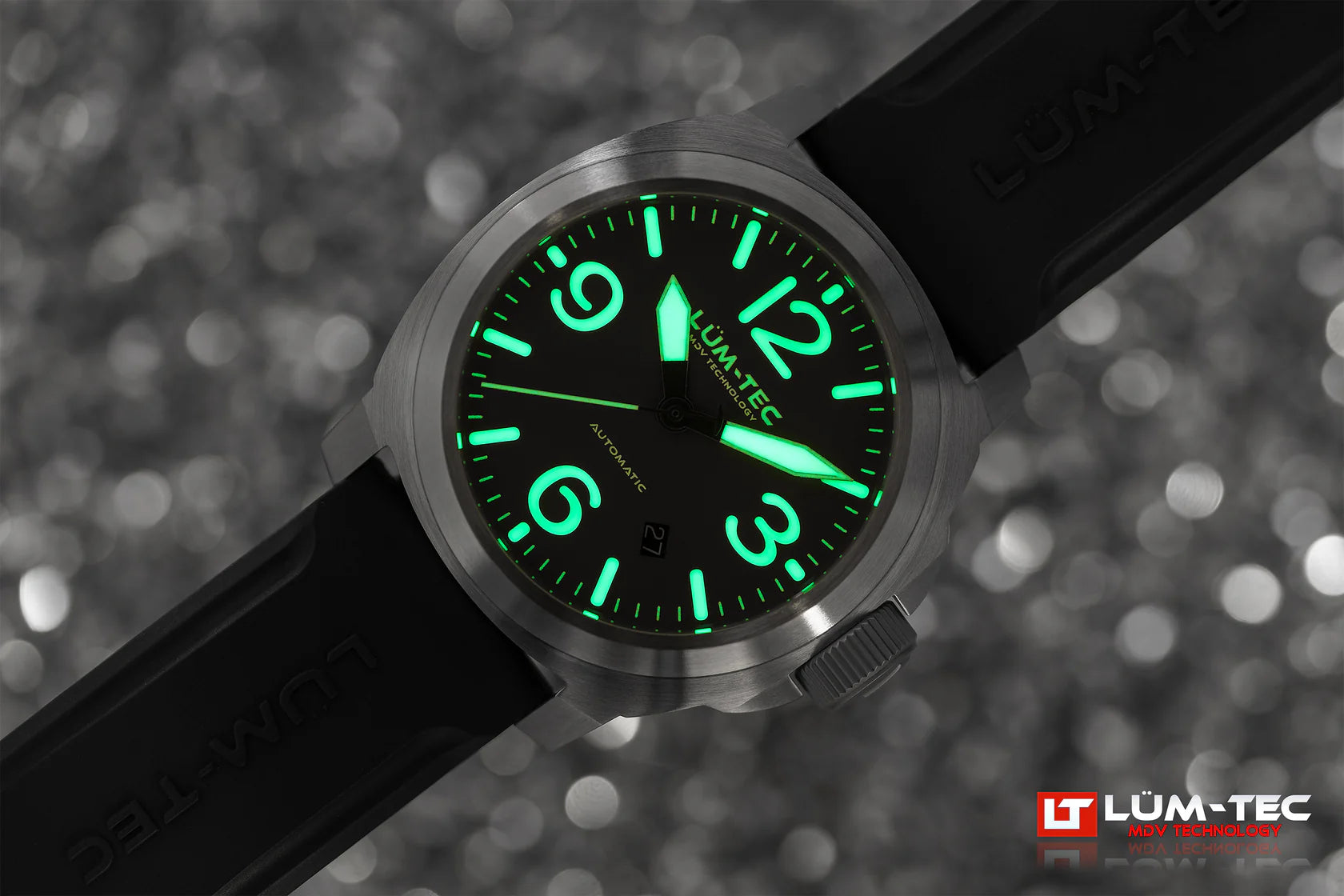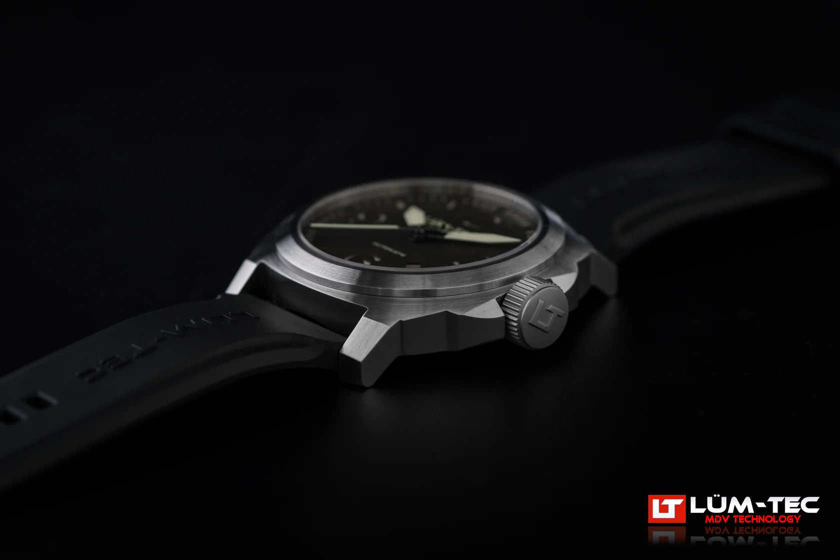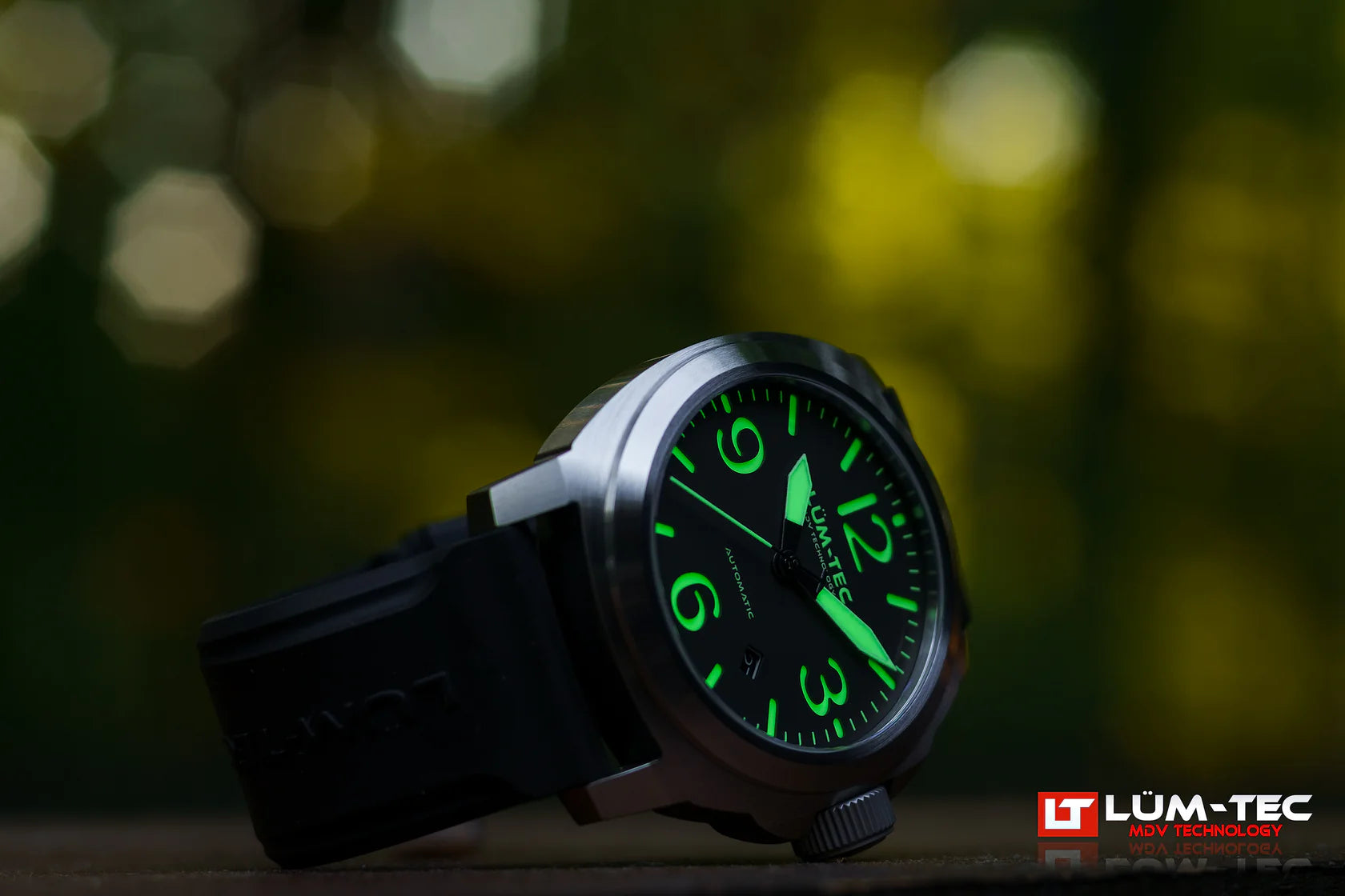 Every LÜM-TEC watch features exclusive MDV Technology, a special 8-layer application of ultra-bright glowing Super-Luminova photoluminescent material. MDV hands and dials are extremely visible in all light conditions, making this watch perfect for red-eye travelers, evening joggers, and casual divers alike.