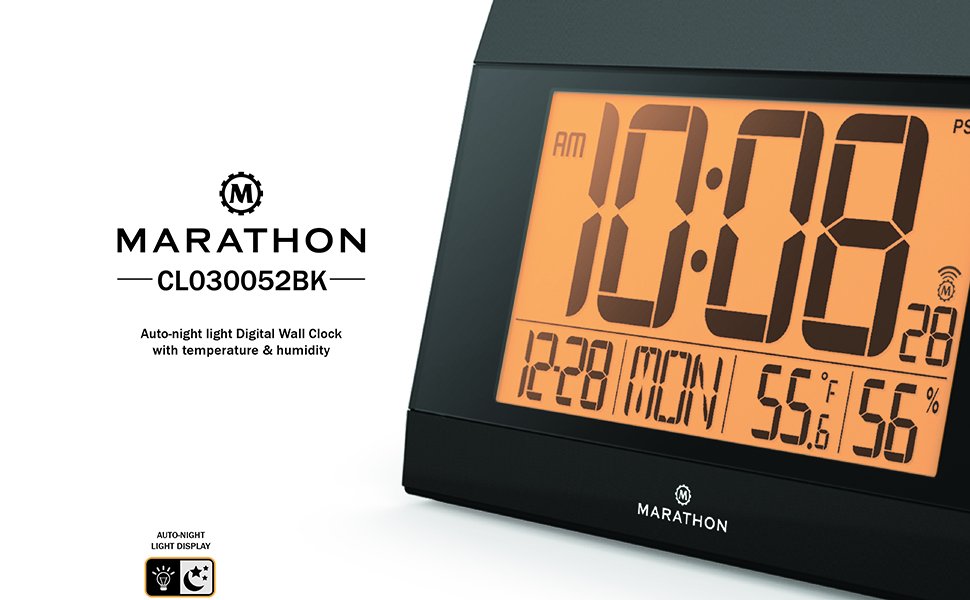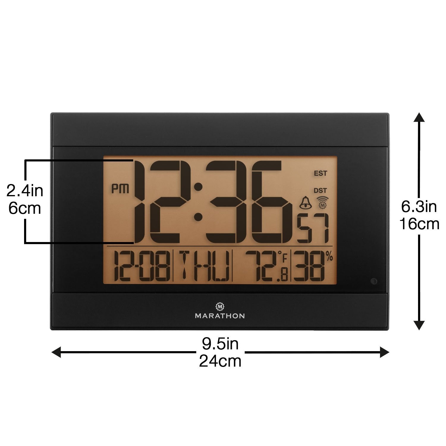 MARATHON CL030052BK Atomic Digital Wall Clock With Auto-Night Light, Temperature & Humidity - Batteries Included