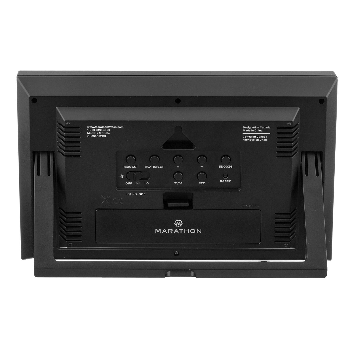 Whether for your office, den, living room, bathroom, basement or garage, we all have places to go and things to do.  We have designed a great addition to all room of your home or office to keep you and your visitors on time. Our wide-angle and easy to read MARATHON Atomic Digital Wall Clock CL030052BK is perfect for just this.  TheMARATHON Atomic Digital Wall Clock CL030052BK displays time synched to master time source, day, date, temperature and humidity on an attractive display panel. What makes it so easy to read? The legible, large numbers! It can be easily read both up close and from across a room. With 7 languages to choose from (English, Danish, Dutch, French, German, Italian & Spanish) our clock speaks to everyone. The Marathon Digital Wall Clock With Temperature & Humidity is part of the new elite line. Although it is wall mountable, it also features a fold-out table stand. The large, wide-angle, easy to read display has an ambient light sensor, which triggers a soft backlight when it is dark. You can easily switch between 6 time zones (Pacific, Mountain, Central, Eastern, Atlantic & Newfoundland), choose from 7 languages (English, Danish, Dutch, French, German, Italian & Spanish) and select Fahrenheit or Centigrade for the indoor temperature display. Along with the time, day, date and indoor temperature, this clock also displays indoor humidity. The MARATHON Atomic Digital Wall Clock (CL030052BK) makes an excellent wall or desk clock and with an alarm and snooze function is also great as bedside alarm clock.