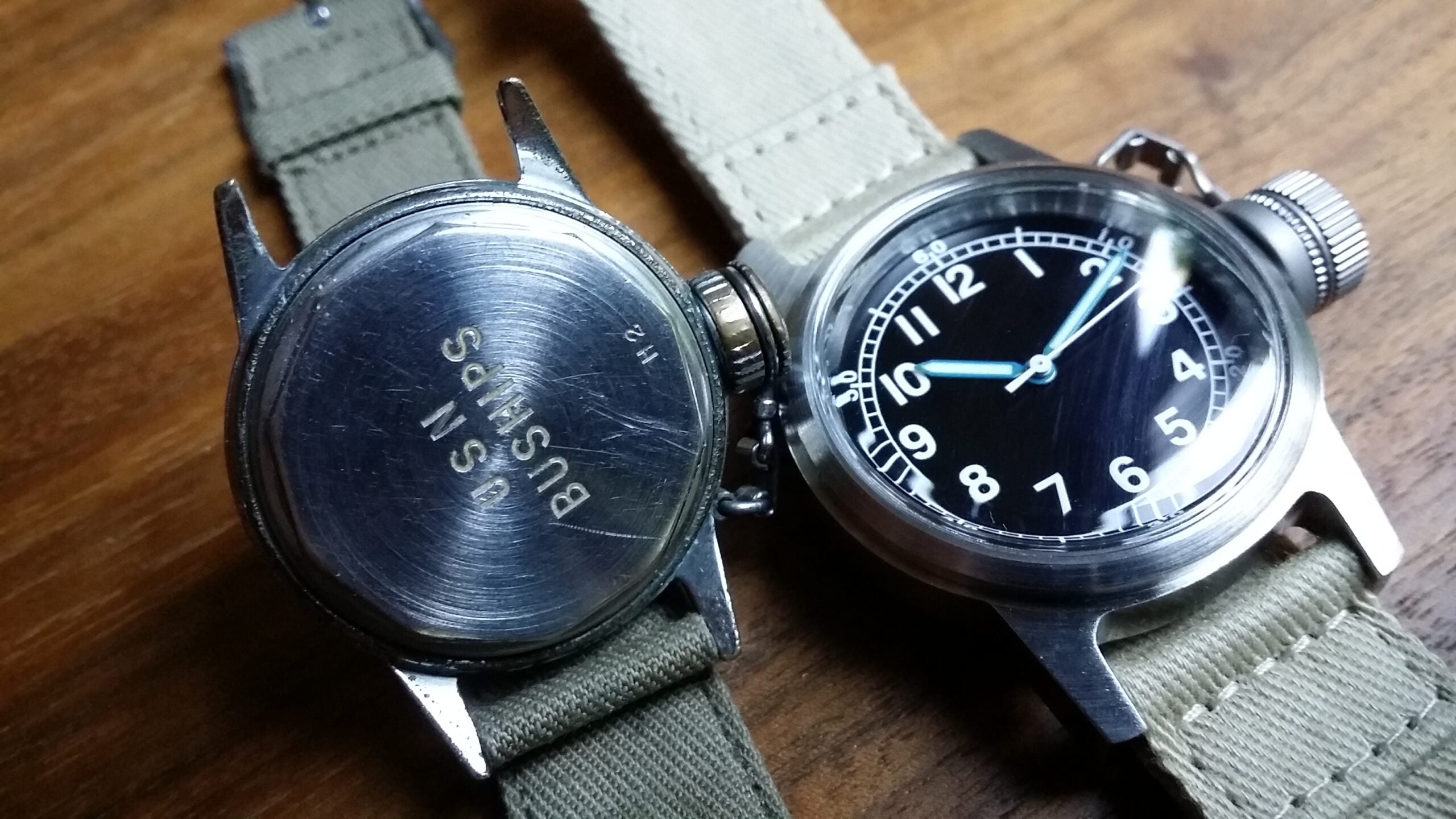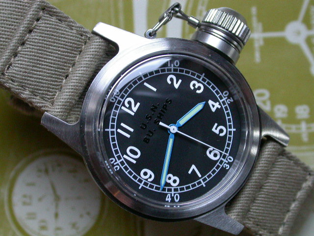 The US Navy Bu. Ships Canteen Watch is like the United States Navy military canteen-style watch that was developed during WWII. It has a very sharp and clear dial with large Arabic numbers. It is nearly identical in look and feel to the Navy SEAL or UDT watch produced by Hamilton and Elgin during World War II and the Korean War - except it is new and has been enlarged to a size more in keeping with modern watches. It has a reliable jeweled quartz movement in it - unlike the original mechanical version which now sells for over $1500!.