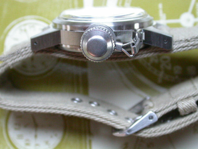 The watch has a heavy stainless steel case with a screw-on back and crown cover. The case back reads: "U.S.N. BU Ships" and the dial reads: "U.S.N BU Ships" in raised black letters. Made by Basel Design, a division of ZENO-USA. This watch also features a hardened acrylic crystal and is water-resistant to 3ATM. This watch possesses a reliable and durable jeweled ISA-1148 Japan Made Quartz Movement (battery included). The luminous blued steel hands have a large diameter of 36mm and a height of 13mm. The band is made from strong khaki cotton that measures 18 mm in width.